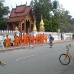 We had to run a gauntlet of women with baskets selling packets of food “for the monks”, but soon came to a spot outside one of the main wats where our guest house receptionist had advised us to watch. Local people were sitting (or kneeling if they were women) in a line on the other side of the road, each with a sash worn diagonally across their left shoulder. Our side of the road was soon crowded with tourists.