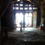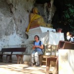 When we arrived at Pak Ou, the truck parked and we walked through the village and down to the riverbank, where we hired a motorised canoe to take us across the Mekong to the caves. Inside there were thousands of Buddhas, some obviously very ancient, but others of gold coloured plastic which were of more recent origin. In the past, the Laotian royal family used to be patrons of this holy site, but since the communist revolution in the 1970s the caves maintenance has been dependant on foreign aid programs,and now tourism.