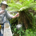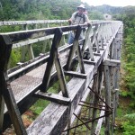 We were very glad to reach the historic south coast tramway, and the first of three huge wooden viaducts. The Percy Burn viaduct is the highest wooden structure of it’s type in the world, and we were privileged to be among the last people to walk over it. Apparently it is likely to fall down in an earthquake, and as it will cost between 2-3 $ million to bring up to standard a new track is being cut down to the river with an ordinary footbridge. In the 1970s these structures were almost derelict, but lots of work has been done since to make a comfortable walkway, but unfortunately not up to an acceptable standard.