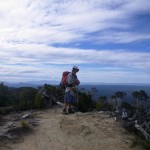 After breakfasting on porridge supplied by the hut warden we were on our way by 8AM. The first couple of hours was mostly boardwalk along the Hump ridge, but after a while the track entered the bush and turned into wooden steps. Thousands of steps, down down down, which is hard on the knees when carrying a pack.