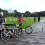 It was nice and sunny when we got out of the car, but about 10 minutes after I took this photo we stopped and put coats on due to the biting wind.   Once suitably attired we enjoyed the ride through Omana Regional Park and past the sports fields at Te Puru Park.