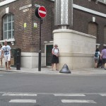 The bell on the footpath in front of Felicity is one of many in the area, marking the presence of the Whitechapel Bell foundry, where Big Ben was cast. The crane over the gate would have loaded the finished bells onto carts for delivery.