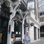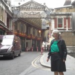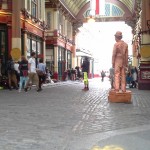 The next stop was the beautiful Leadenhall Market, which was used in the Harry Potter film as the location for Diagon Alley. In the centre of the market, we discovered that another film was being made, so we kept very quiet while I surreptitiously took a photo. The copper coloured statue (played by Tom Bell) then turned around and asked if we wanted to be extras, so we were directed to stand behind him pretending to look at my tablet. The film is called “Passing By” directed by Palle Nodeland.