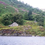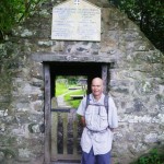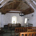 We reached Llyn (lake) Geirionydd in the early afternoon and followed a couple of local guides and their American clients down to the lake shore. The guide told us that “just ten minutes” up the road we could see Llanrhychwyn, the oldest church in Wales, which dates from the 11th century. There was a church on the site in 600AD, when Christianity had died out in England (the dark ages). It took more like 20 minutes each way, even at our relarively fast pace, but it was well worth the detour. The church today is in the corner of a farmer’s paddock, and the back wall had tractors and farm implements parked beside it. But when we walked through the stone gate it was like travelling centuries into the past. The church was unlocked, so I opened the door with some effort due to the fact that the wall is not straight up and down. The windows in the photo had what looked like stained glass but we read that it had been coloured after it was made, and is the oldest known glass in Wales.