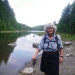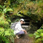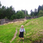 Just before midday we reached the old Hafna mine site where there used to be a smelter. I guess they were mostly mining lead, because the chimney was quite a distance away due to of toxic fumes. When the mine closed it had a huge steam engine to drive the bellows, but originally they were operated by water flowing from a dam up in the hills behind. We set off up the hill to see, but got distracted for ten minutes or so by a bank covered with ripe blueberries. When we reached the top our fingers and lips were stained purple!
