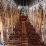 Our second stop for the day was Dunblane Cathedral. It isn’t the slightest bit ruined, in fact it is still in daily use. As we were leaving, a hearse was backing up to the door for a funeral. The tower was built in the 11th century, but most of the huge building is Gothic from the 13th century. The stained and painted glass windows were very impressive, even if they were relatively modern (about 200 years old).