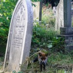It was a nice peaceful spot to eat lunch though, and seeing the fox was a big bonus. A man there feeds them, so it was not very scared of us, and let Felicity get to within 3 metres before it started backing away. It was eating something behind a gravestone, and was clearly not in a hurry to leave despite our presence. If I was a local resident I would not be too happy about people teaching foxes not to fear humans; an adult would not be in any danger but a small child might be. The animal itself is quite small, but it has a huge bushy tail which would obviously make a great fur coat. Since it has become uncool to hunt or kill them, the fox population has exploded, even in inner city areas. Eventually a woman with a dog walked past, and the fox took off.