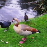 I had seen on Google maps that the New River and Pymme’s Brook cross, and wondered how this could be. This was explained when the aqueduct crossed a valley with the brook down below us. The route along the waterway was a bit muddy and not terribly exciting, so we turned off at the next road crossing and headed through Broomfield Park to find the real river. At a pond, Felicity took a picture of a strange looking bird which turned out to be an Egyptian Goose. I wish we had found one of them in the market.