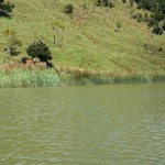 At first we passed high mangroves on either side, but they soon thinned out and we could admire the mostly native bush along the banks. Some of the hills behind had rows of pine trees, but they only rarely come down to the waters edge.