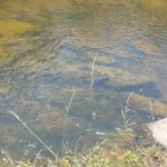 We had noticed lots of small fish jumping in the upper reaches of the river, but while we were eating lunch we realised that the river was teeming with hundreds of fish, some of them dinner size. My photo barely shows two of them, even though there are dozens in the shot. You’ll just have to take my word for it.