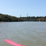 I stuffed it quickly back in its bag, freeing both hands. I tried hard to paddle away, but the paddle leash wound around a branch held me firmly in the danger zone. I pulled it free, and paddled with all my might. The rudder caught, I started to turn over… then the rudder pulled free and I straightened up in the nick of time.