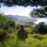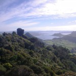 The track continued steeply upwards, eventually reaching the bush. The council has put a lot of effort into building wooden steps which made progress relatively easy. We stopped at the site of one of NZ’s first radar stations, a military secret when it was first installed. All that is left now is some crumbling concrete structures and a rusty steel mounting that looks a bit like a periscope.