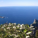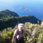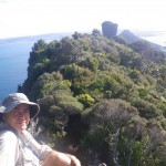 We kept climbing, following a ridge that got steeper and narrower. Near the top, a short side trail lead to a rocky outcrop with spectacular views up the coast towards Pataua in the north and across the harbour to Ruakaka ans Waipu to the south. A big bunch of teenagers were climbing further up the rock stack, and we followed them some of the way until Felicity started worrying about getting down again. There must be good possum control in this area because we could see Rata flowers everywhere.