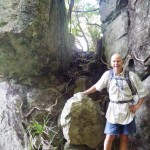 The ridge track turned to the west and continued towards Mt Lion. It passed lots more rock outcrops, sometimes along side walls and at one point though a gap between two huge boulders that joined above our heads. There was another spot where we were able to climb up a ladder of rata roots to enjoy a view up the harbour towards Whangarei.