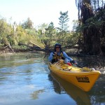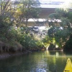 The southern branch of the Okura winds its way up to the East Coast Road bridge, then under the motorway. The tide had turned by this time, and I felt a couple of logs near the surface as I paddled over and wondered if I would get back over on the way down. Eventually our way was blocked again, although we could see that if we had arrived just on high tide we might have made it further. Next time I must remember to bring the small handsaw that I carry in my bike backpack.