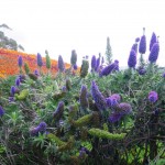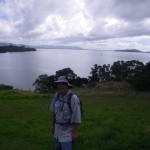 It rained a little bit overnight, but by the morning it had cleared again so we drove back north a bit and out to Kauri Point. The first section of the walk was over an open grassy area along the harbour. There were houses inland from us, some with attractive gardens filled with bright flowers.