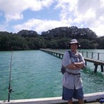 There were a flock of white-fronted terns and some gulls sitting on the railing, and as we got within 2 metres of them they flew off one-by-one, circled around us and landed back near where they had been. When we walked back they had to do it all over again. In the photo you can just see them in front of the trees near the beginning of the jetty.