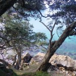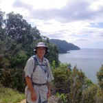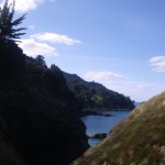 The track wound it’s way along the top of the cliffs, dipping in and out of native bush. At one point we met a whole class of children returning from a picnic on the last day of term. After about 40 minutes we descended on to the white sand of Orokawa bay.