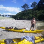Around the next headland we saw Hot Water Beach. There were even bigger waves breaking here, but I convinced myself that the very northern corner where the creek empties out was slightly sheltered and I headed in. There were only about half a dozen people to witness any disaster, and when a wave started turning me sideways I thought they were going to be in luck, but I managed to dig my paddle in just in time, and got to the beach without turning over.