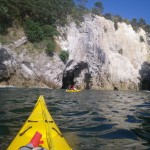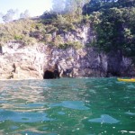Commercial kayak tours south of Hauhei are promoted as “remote coast”, and only leave in the mornings before the wind gets up. We were on the beach ready to go soon after 8.30 am, so we had a chance to talk to the tour guide before any of his customers arrived. He told us to beware of hidden reefs, and to check out caves carefully before paddling inside. Most importantly, he drew a map on the sand to show us where to find the ‘blow hole’.
