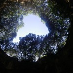 I’m glad the guide had told us where to find the entrance to the blow hole because I would probably not have dared paddle into such a small cave without his advice. I sat outside for a while nervously until I noticed a glimmer of light inside, and that gave me the confidence to head in. After a few metres it opened out into a calm pool with plenty of room to turn around, and even a rocky beach that we could have landed on had we wished. Above us was an almost circular hole surrounded by trees, with the light filtering in. We were both reminded of the limestone ‘hongs’ that we have visited in Thailand.