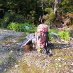 The sleep-out behind the photo of Jocelyn and I preparing to leave in the morning is the same design as the one we slept in, which is behind it in the trees. The weka came to see if my water bottle was worth dragging into the bushes before I could put my pack on.