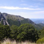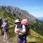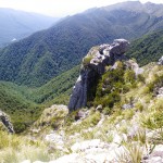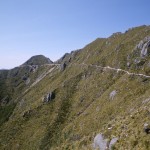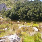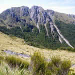 We continued walking through the forest for another kilometre or so, until we reached the tree-line and came out onto the tops. In the distance, we could see the Main Divide covered in snow from the precipitation of Friday night – no wonder it was cold.