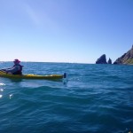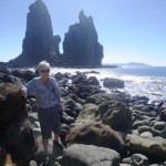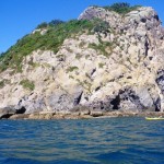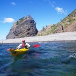 The Pinnacles are not actually an island as shown on the map, although I am sure that the waves would wash across the narrow spit in a big storm. We landed on a little beach and walked around the coast over the boulders looking for a sheltered spot for a swim, but ended up returning to the kayaks and swimming there.