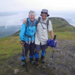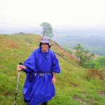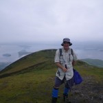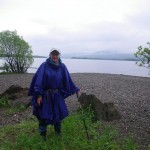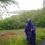 A bit further on we came to a steep path up Conic Hill. I was quite hot climbing up, but a light drizzel and a bit of wind at the top forced me to put my poncho on after we took the obligatory photographs. We were lucky to get a view at all, because as we started down the other side towards the loch, it started to rain and the summit was lost in the clouds.