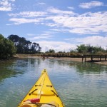 As we paddled out from the creek where the ramp is situated we found ourselves heading into a bit of a breeze and decided not to go too far in case the water got choppy when the tide began going out again. Around a small headland we followed a sand bar inhabited by hundreds of oyster-catchers and dotterels, then headed through mangroves into a small river. At regular intervals big mullet jumped half a metre out of the water and splashed back in, making us wonder what was chasing them.