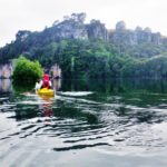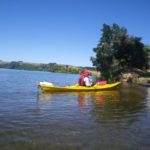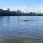 When we arrived at Arapuni Landing on Saturday, we saw a guy swim past towing a small catamaran with gear piled on top. Later on that day we saw him swimming back in the opposite direction. After our second kayak trip on Sunday, we had just enjoyed a swim and were standing on the beach when the swimmer appeared again, came straight into shore and stopped for an energy drink.