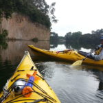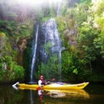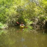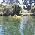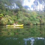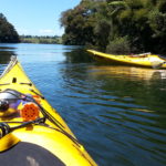 There was a great space free right on the edge of the water, so I manoeuvred the motorhome until it was level, then Felicity packed lunch while I unloaded the kayaks. Unfortunately, the lake was infested with fizz-boats towing water-skiers and inflatable biscuits, so we decided to explore the narrow Mangare Stream that we could see on the map a little way to the south west.