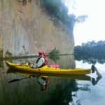Next morning the lake was still and mirror-like, so we paddled off north towards the dam. This section of the river has high, rocky bluffs which we could often paddle right beneath. We explored a couple of short side-streams, one of which had a pretty waterfall flowing into it.