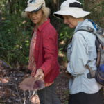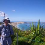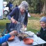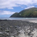 Felicity and Robyn were keen to collect mussels from the rocks at the western end of the bay, so we trudged along a 4WD track behind the dunes for an hour or so to get there. We left the track just before the board-walk across the Waitahora Lagoon to Pandora, and followed the beach to the rocky cliffs. It had started to rain by this time, but we pulled on our ponchos and started hunting and gathering. The tide was a little bit too high, but we eventually got enough shellfish to feed the four of us.