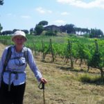The day got hotter and hotter, and we could understand why we have not seen any other walkers. Just after midday we reached the famous Carparzo winery. We certainly didn’t intend to drink a bottle with lunch, but we pretended we might buy one and tasted a white chardonnay/sauvignon/gewurztraminer blend that I thought was a bit average, and a red Brunello di Montalcino Sangiovese which is the specialty of this area. It is supposed to be one of the best red wines in the world, and while it is not bad, I think I still prefer a nice NZ Pinot Noir. The winery has a shaded “pilgrims break” spot which we took advantage of to eat our picnic and recover from the wine tasting.