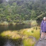 We missed the turnoff to our next planned destination, and the first place it was possible to turn was at the start of a 30 minute walk to Lake Wilkie. This was once an open lake behind sand dunes, but over the years it has filled with sediment and the forest has encroached, and is now technically a bog lake. Informative signs demonstrated the transition zones – from moss and sedges at the lake edge, through tea-tree and water tolerant shrubs a bit further away, and eventually to mature podocarp forest.