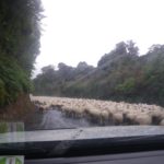 Florence Hill lookout seemed like a nice place to stop for lunch, with spectacular views over Tautuku Bay. There is a walkway to from here to some “spouting caves”, but it was raining pretty heavily by this time and we had had enough of being cold and wet. While we were sitting eating, a huge flock of sheep were herded through the carpark by a farmer in a ute and a couple of dogs. When set off again we encountered them on the highway, and had to drive slowly for a few hundred meters while we passed them.