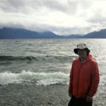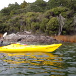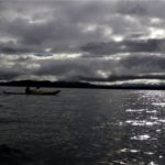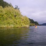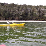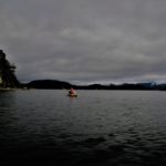 We paddled out into the lake, around the shore of Surprise Bay, and out to the point where we could look down the western end of the lake. The water was fairly calm, but there was low cloud so we couldn’t see many of the mountains that surrounded us.